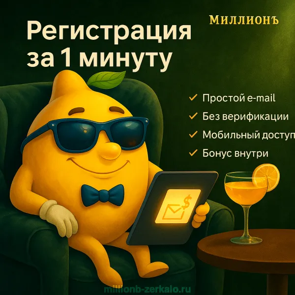 На главной странице казино с привычным логотипом лимона в солнцезащитных очках посетители могут выбрать несколько способов для регистрации. Функция «Быстрая регистрация» расположена в левом верхнем углу и открывает стандартную форму, в которую нужно ввести свой адрес электронной почты, создать логин и пароль. После этого на указанную почту будет выслано уведомление с ссылкой для активации аккаунта. Весь процесс занимает не больше нескольких минут. При регистрации в «Миллионе» новички также могут получить следующие бонусы: